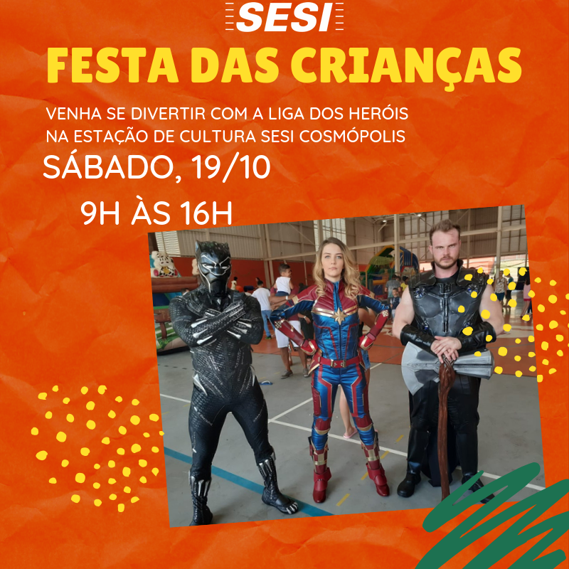 Neste sábado, dia 19 de outubro, a Estação SESI de Cultura de Cosmópolis realiza, das 9h às 16h a Festa das Crianças. Além de diversas atividades que o espaço oferece, haverá a presença da Liga dos Heróis interagindo com as crianças.